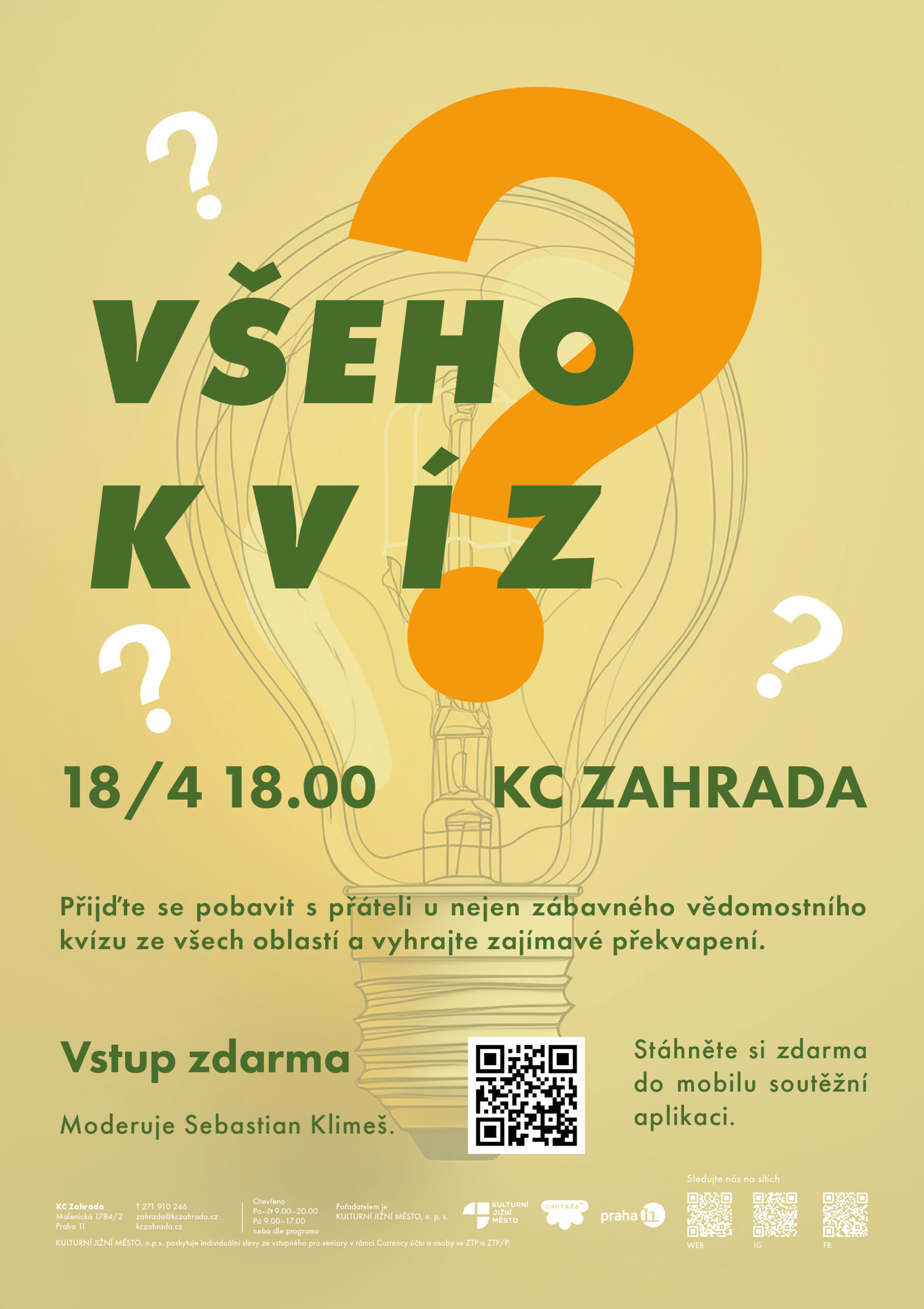 Přijďte se pobavit s přáteli u nejen zábavného vědomostního kvízu ze všech oblastí a vyhrajte zajímavé překvapení. Moderuje Sebastian Klimeš.