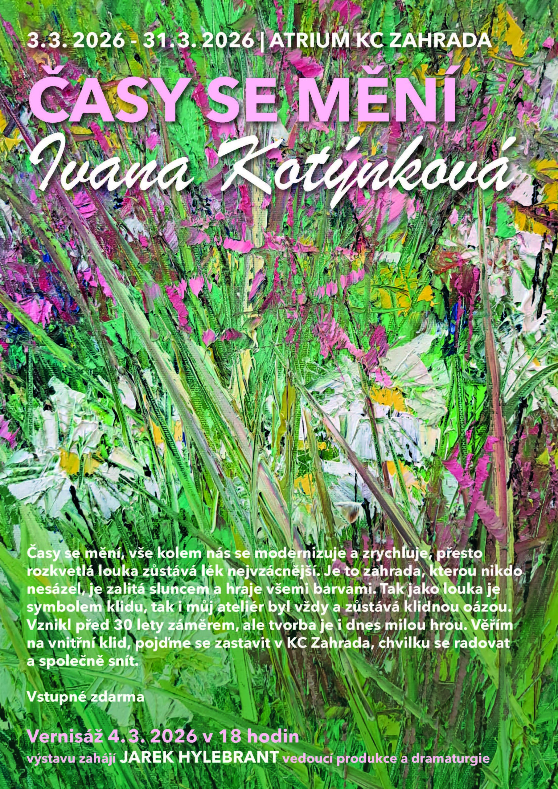 Vše kolem nás se modernizuje a zrychluje, přesto rozkvetlá louka zůstává lék nejvzácnější.  Je to zahrada, kterou nikdo nesázel, je zalitá sluncem a hraje všemi barvami. Tak jako louka, je symbolem klidu, tak i můj ateliér byl vždy a zůstává klidnou oázou. Vznikl před 30 lety záměrem, ale tvorba je i dnes milou hrou. Věřím na vnitřní klid, pojďme se zastavit v KC Zahrada, chvilku se radovat a společně snít. Vernisáž 4.3.2026 v 18 hodin.